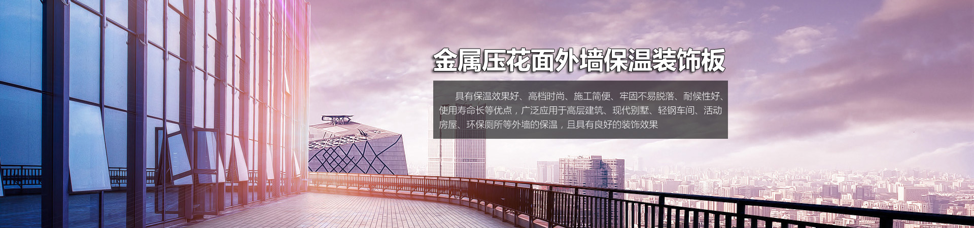 公司擁有先進的金屬壓花面外墻保溫裝飾板電腦控制自動生產線,年生產能力40萬平方米,可生產磚紋、彈涂紋、水波紋、木紋、礫石、細石、理石等多種紋樣花型、和多種色彩的產品,能全方位滿足中高檔寫字樓、商品住宅樓、現代別墅等建筑外墻保溫及裝飾的需要。【詳細】